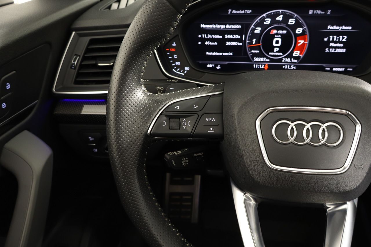 Suspensión neumática, techo solar panorámico, tapicería de cuero mixto junto con asientos deportivos, sistema de navegación MMI, asientos eléctricos, faros Matrix LED, asientos delanteros y traseros con calefacción, cámara 360 junto con sensores de aparcamiento, climatizador de 3 zonas, sistema de sonido Bang & Olufsen, alerta de mantenimiento de carril, regulador de velocidad ADAPTATIVO, ordenador de viaje, sensor de lluvia y luces, portón trasero eléctrico, retrovisores abatibles eléctricamente, volante S Line con levas de cambio, Audi Virtual Cockpit, iluminación ambiente, diferencial trasero deportivo, Audi Phone Box, Advanced Key, lunas traseras tintadas, 4x4, llantas de aleación en 21, Bluetooth, conexión AUX y USB.