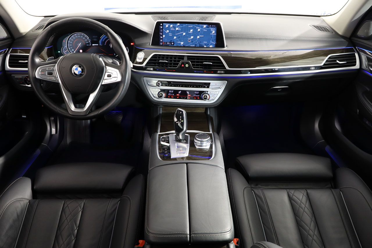 El interior de este BMW Serie 7 es un santuario de lujo y tecnología. La tapicería de cuero Napa ampliado envuelve los asientos eléctricos con memoria, que además son calefactados, proporcionando el máximo confort en cualquier estación. El techo solar panorámico inunda el habitáculo de luz natural, creando una atmósfera de amplitud. La experiencia auditiva está garantizada por el equipo de sonido Harman Kardon, que transforma cada viaje en un concierto privado. El bienestar de todos los ocupantes está asegurado gracias al climatizador de 4 zonas, que permite personalizar la temperatura en cada rincón del coche. La suspensión neumática, por su parte, asegura un viaje excepcionalmente suave y placentero, absorbiendo las irregularidades del terreno con maestría.
