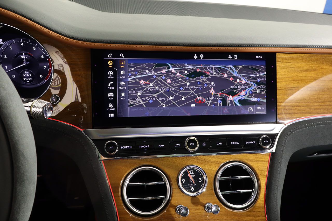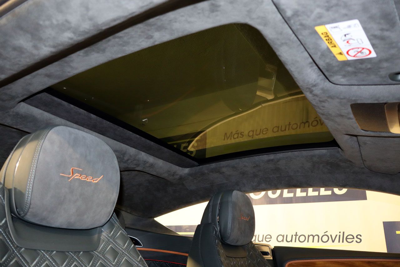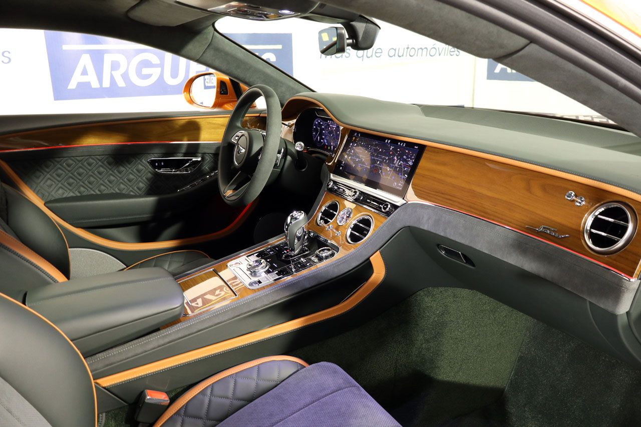El interior de este Continental GT Speed es un santuario de artesanía y confort. La tapicería de cuero mixto bitono con costuras en forma de diamante es una obra de arte, un testimonio del meticuloso trabajo manual que Bentley infunde en cada detalle. Los asientos eléctricos con memoria no solo son calefactados y ventilados, sino que ofrecen un soporte excepcional para viajes largos. El techo en Alcántara añade un toque extra de sofisticación y calidez. Las molduras interiores en madera pulida complementan la atmósfera de exclusividad, mientras que el volante multifunción de cuero y Alcántara calefactado con regulación eléctrica pone el control al alcance de sus dedos. Incluso el cierre de puertas es una experiencia en sí misma, con el sistema softclose que las sella con una elegancia discreta y silenciosa.