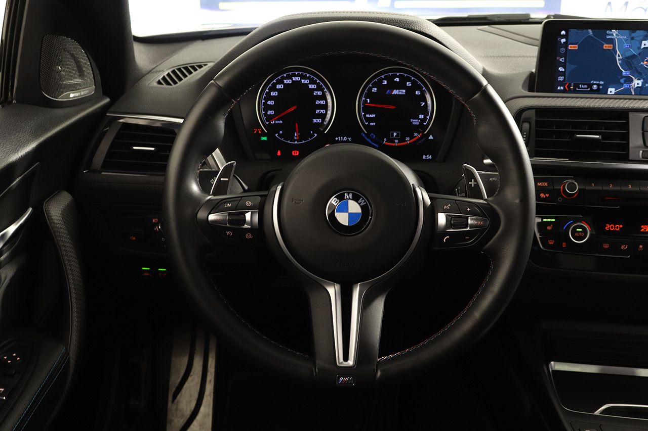 El interior de este M2 Competition es un santuario de deportividad y tecnología. Los asientos deportivos en cuero Dakota con pespunte azul no solo ofrecen una sujeción perfecta en conducción dinámica, sino que también son calefactados para el máximo confort. La navegación Professional te guiará sin errores, mientras que el sistema de sonido Harman Kardon envolverá el habitáculo con una calidad acústica sublime. La seguridad no se queda atrás, con faros LED, cámara de visión trasera, sensores de aparcamiento, y alertas de salida y de cambio de carril. El climatizador bizona, el volante multifunción con levas de cambio, la carga inalámbrica junto con Apple CarPlay y Android Auto, y las lunas traseras tintadas completan una experiencia a bordo de lujo y conectividad.