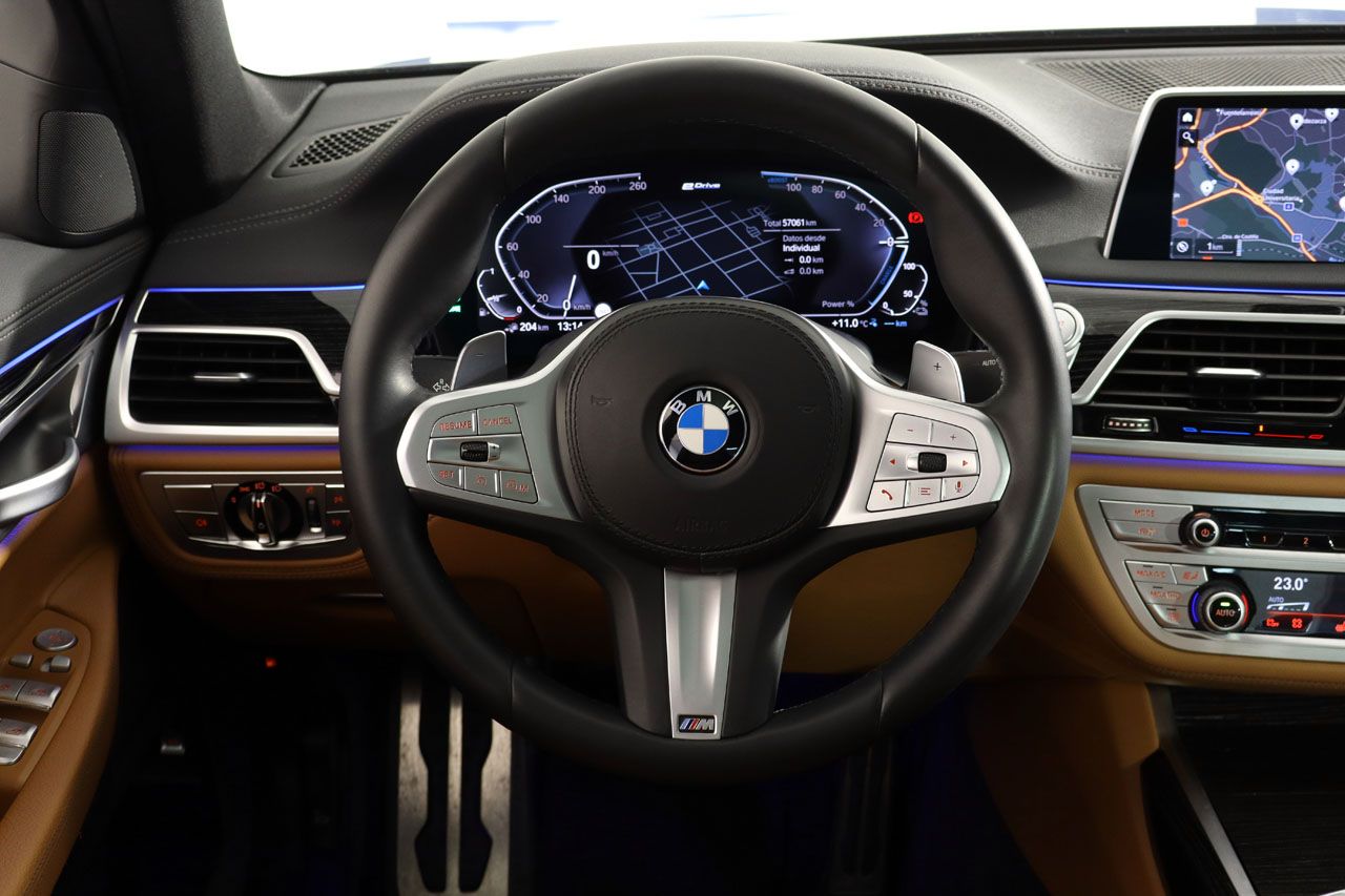 IVA Deducible. Vehículo nacional de único propietario con historial completo de mantenimiento. Híbrido enchufable con 50kms de autonomía en modo eléctrico, lo que le otorga la Etiqueta 0 Emisiones de la DGT. Suspensión neumática, techo solar panorámico, tapicería de cuero Dakota, asientos eléctricos con memoria, sistema de navegación, faros LED, asientos calefactados delanteros y traseros, cámara 360 junto con sensores de aparcamiento, climatizador de 4 zonas, Head Up Display con proyección en el parabrisas, alerta de vehículos en ángulo muerto y de salida involuntaria de carril, regulador de velocidad, portón trasero eléctrico, volante multifunción eléctrico, retrovisores abatibles eléctricamente, carga inalámbrica, radio DAB, lunas traseras tintadas, volante M multifunción, iluminación ambiental, acceso sin llave, llantas de aleación M en 20, pintura negro metalizado, Bluetooth, conexión AUX y USB. +131.000EUR NUEVO, CONSULTAR LISTADO COMPLETO DE OPCIONALES.