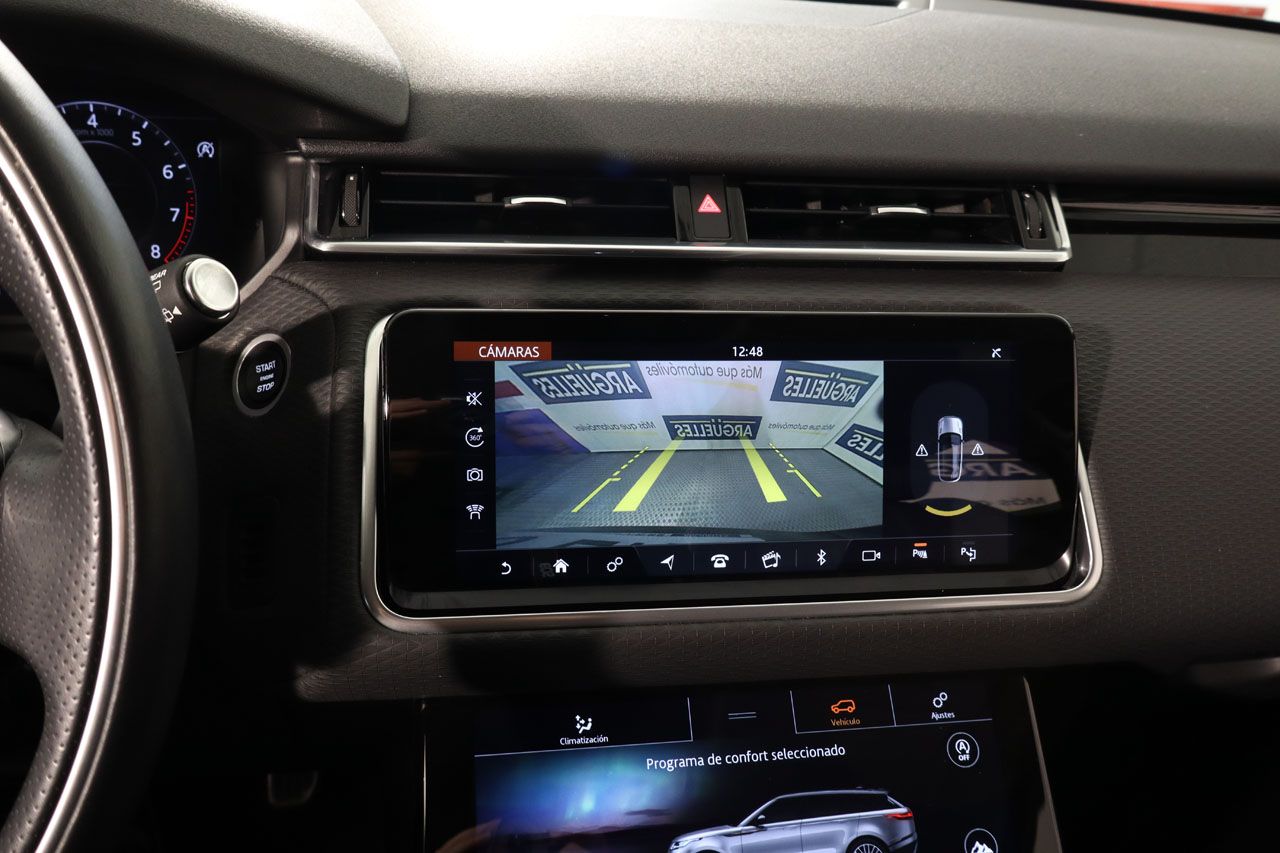 La seguridad y la conectividad son pilares fundamentales en este Velar, equipándolo con lo último en asistencia al conductor. Sistemas como la alerta de vehículos en ángulo muerto y la alerta de salida involuntaria de carril proporcionan una capa extra de protección en carretera, reduciendo el riesgo de incidentes. El regulador de velocidad y el ordenador de viaje hacen los trayectos largos más relajados y eficientes. La comodidad se eleva con el sensor de lluvia y luces automático, el volante multifunción con levas de cambio para un control intuitivo y deportivo, y un portón trasero eléctrico que facilita la carga y descarga. Los retrovisores abatibles eléctricamente y la iluminación ambiente personalizable añaden toques de sofisticación. La integración perfecta con su vida digital está asegurada gracias a Apple CarPlay y Android Auto, junto con acceso y arranque sin llave para una mayor comodidad.